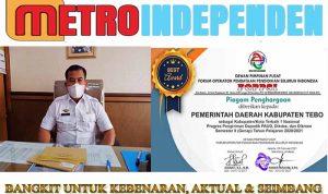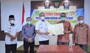Kemudian dilakukan penyerahan Naskah Perjanjian Hibah Barang Milik Daerah Pemerintah Kabupaten Tebo berupa tanah dan bangunan kepada Kepala Desa Teluk Langkap Sukandi.